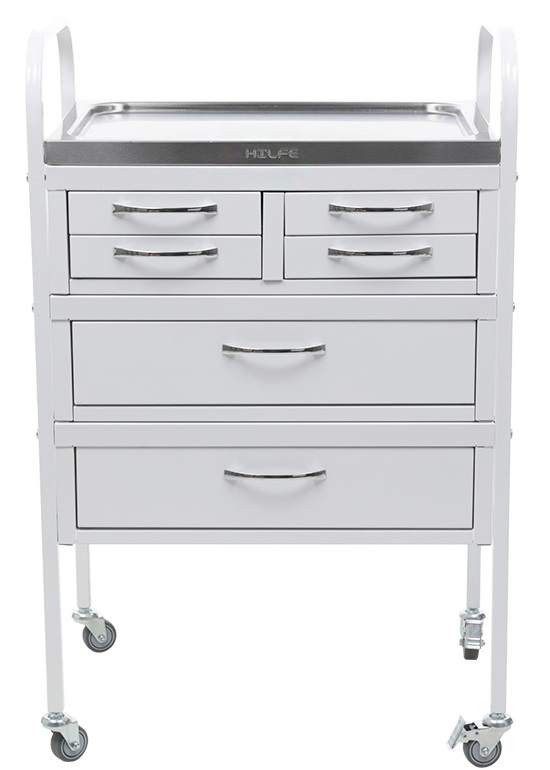 - Полка и выдвижные ящики образуют пять уровней хранения. Выполнены методом «прессовой вытяжки» из высокопрочной нержавеющей стали 1 мм, устойчивой к возникновению трещин и сколов, а также к обработке дезинфицирующими средствами.
